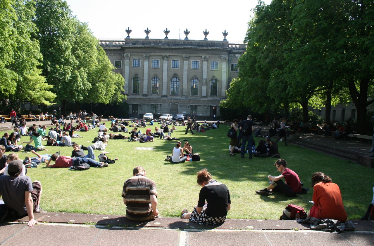 Studenten op de binnenplaats van de Humboldt-Universität in Berlijn.