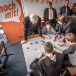 Minster Steinmeier en Koenders kijken mee met een Mach-mit-les in Eindhoven.
