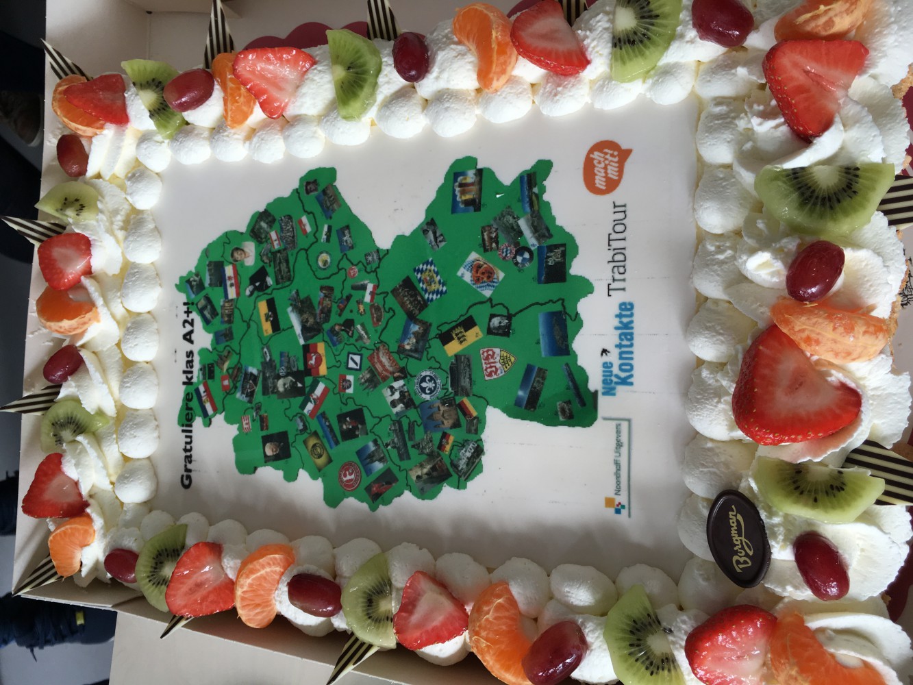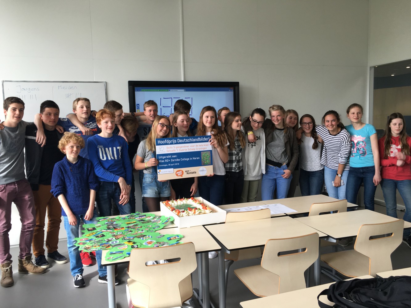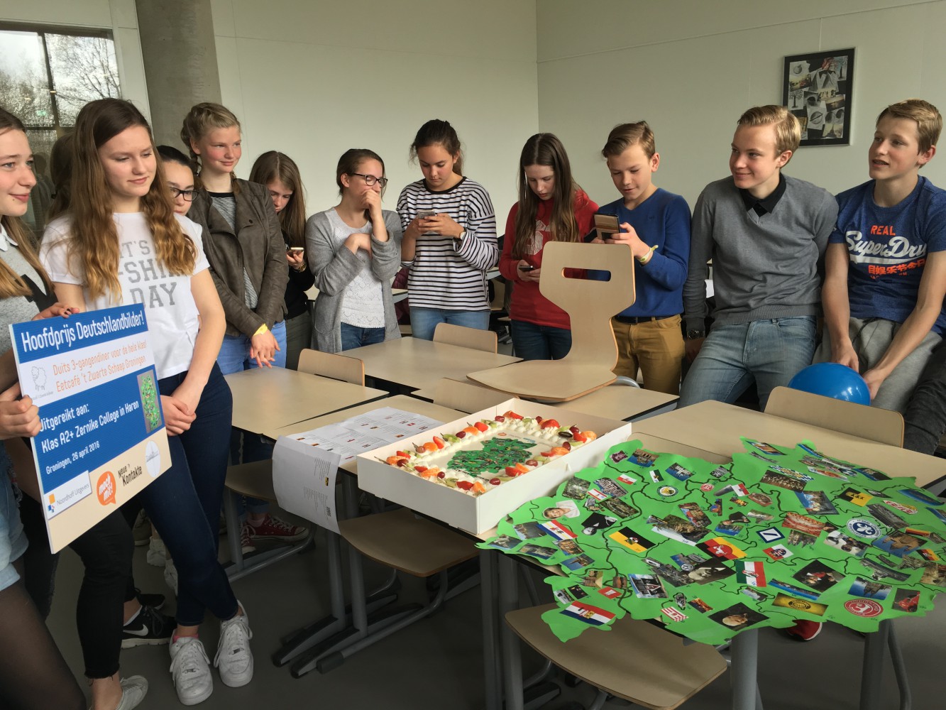 De prijs was een mooie taart met de afdruk van de winnende poster en een 3-gangendiner voor de hele klas in eetcafé ‘t Zwarte Schaap in Groningen. ‘t Zwarte Schaap gaat speciaal voor de klas een Duits menu samenstellen!