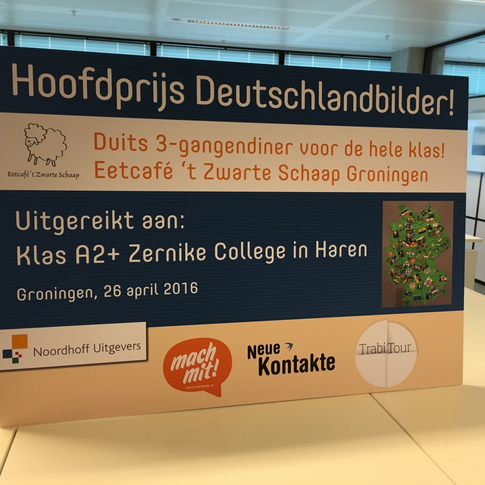 Klas A2+ van het Zernike College neemt hoofdprijs in ontvangst! Afgelopen dinsdag heeft de sponsor Noordhoff uitgevers de hoofdprijs voor de posterwedstrijd ‘Deutschlandbilder’ uitgereikt aan klas A2+ van het Zernike College in Haren.